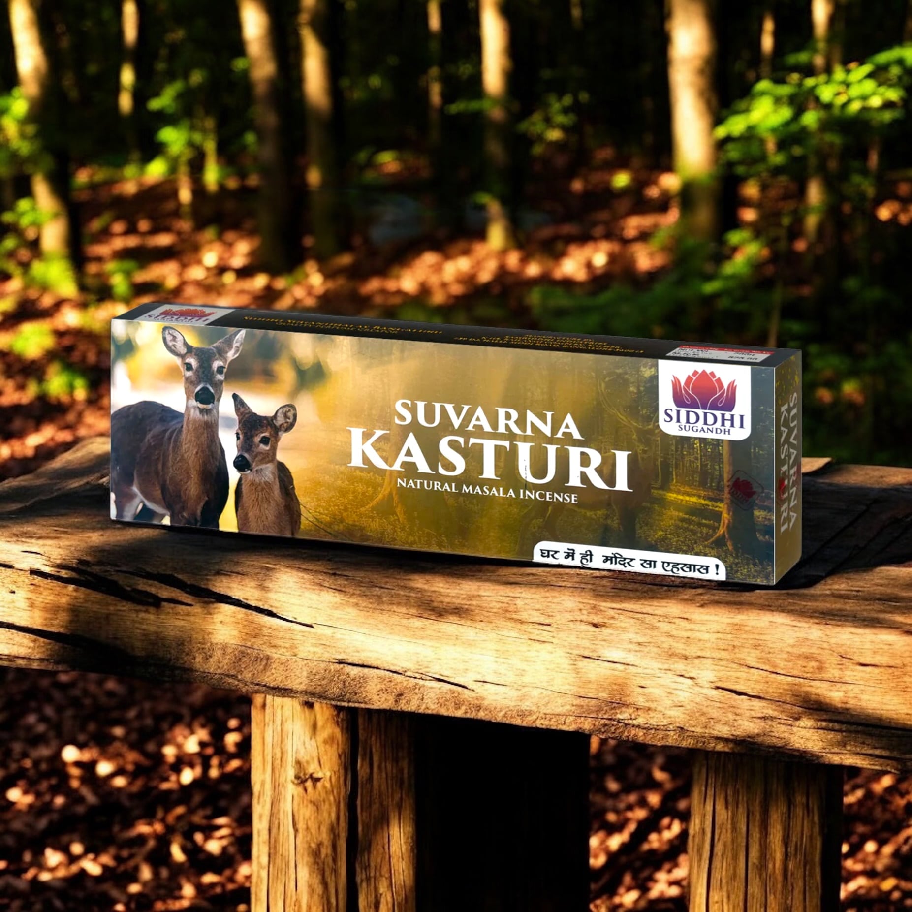 Relish the royal aroma of Siddhi Sugandh Suvarna Kasturi, a 200 gm pack of 9-inch hand-rolled masala sticks from the Natural Masala Series. Infused with the luxurious essence of kasturi, this incense creates an ambiance of opulence and spirituality, making it ideal for special occasions and devotions.